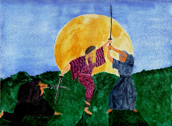 Dancing by Moonlight –LE – Watercolor on multimedia paper 9×12″, based on a photo of my son’s scene choreography for a student film he worked on…