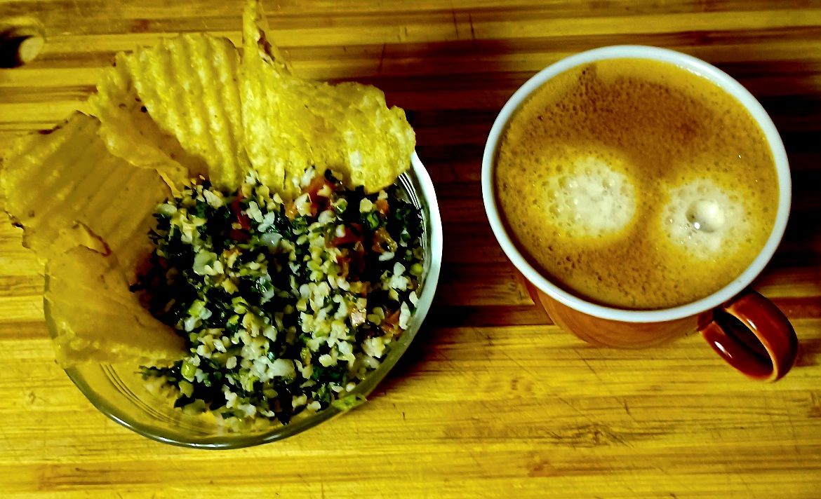 PS: My Tabouli is made with bulgur, tomatoes, cucumbers, parsley, mint, green onions, fresh squeezed lemon juice, and a little olive oil. The espresso in the picture is roughly three shots. The ridgecut chips are from Trader Joes…