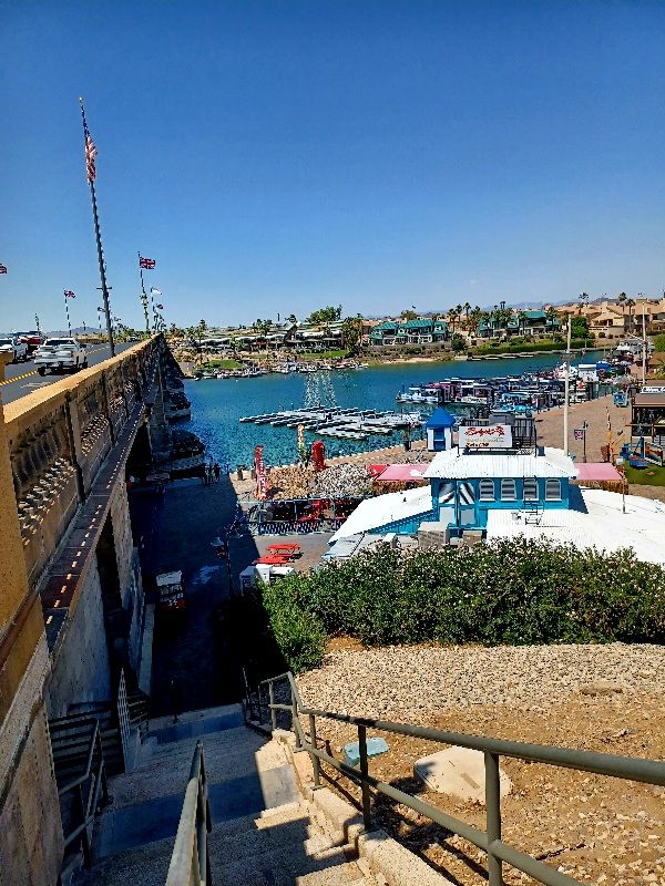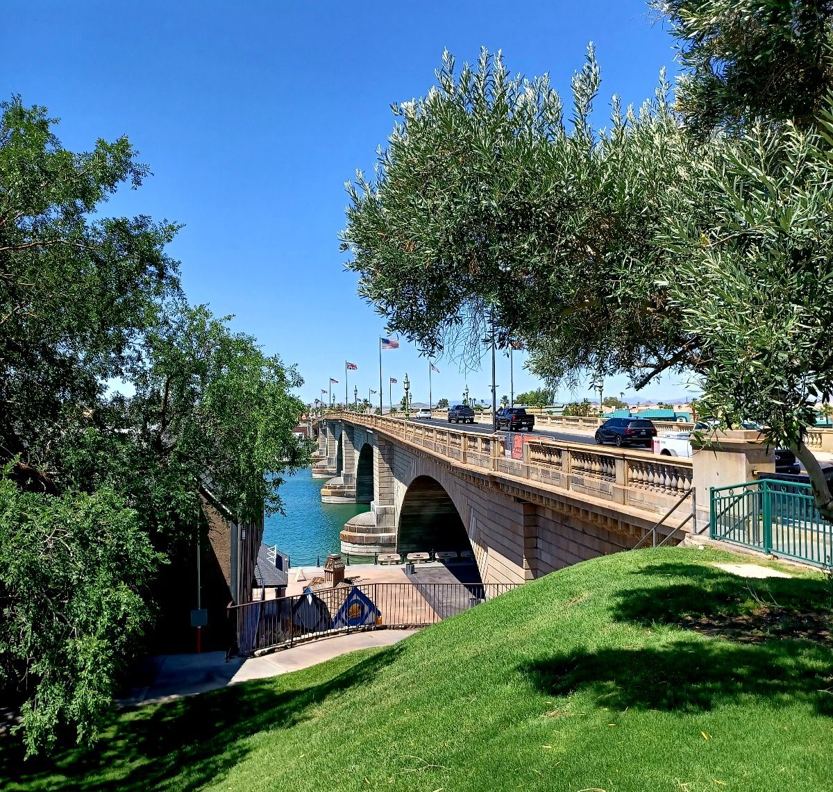 Well, not anymore. Because it was falling down (so to speak), a new bridge was built to replace it. The old bridge was sold to an American industrialist, Robert McCullough, who had it disassembled and transported to Lake Havasu AZ, where it was reassembled on a peninsula on the western shore of the lake. Then, a channel was dug under the bridge, forming a small island on the western side of the bridge. McCullough planned and built Lake Havasu City on the 26 square miles he purchased around the lake.