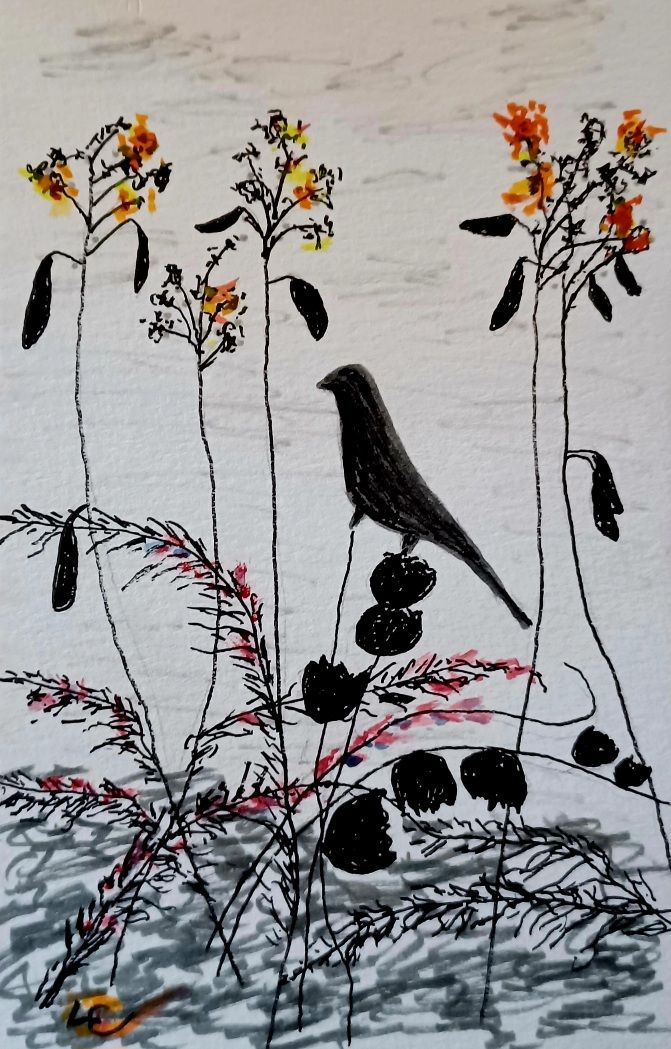 I’m glad to help if I can… First, I took a picture with my phone, the subject is in my front yard. Then I took my watercolor sketchbook and very lightly sketched it out the pertinent image, leaving out most of the background, with a very hard pencil HH (I think – but that isn’t really important, only that the sketching is light enough to be easily covered). Then I went over it with Micron pens of different widths, both black and gray. then finished it off by adding the watercolors in dabs … first, a couple of different shades of yellow, then orange, and finally, reds (2 different shades)… Hope this helps…; -)